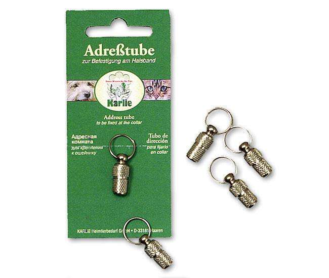Mit der silberfarbenen Adresstube für Katzen und Hunde weiß jeder zu wem Ihr Tier gehört.