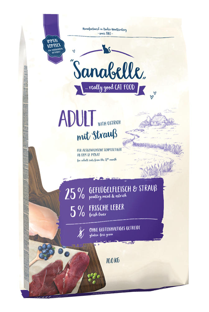 Sanabelle Adult mit Strauß ist eine bek&ouml-mmliche und schmackhafte Vollnahrung zur bedarfsgerechten Ernährung ausgewachsener Katzen. Die ausgewogenen Gehalte an Mineralstoffen, Spurenelementen und Vitaminen sind eine Grundlage für Vitalität und Lebensfreude und unterstützen die natürlichen Abwehrkräfte Deiner Katze.