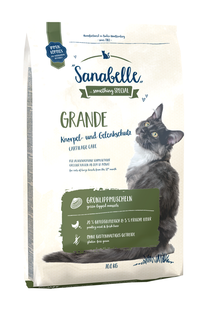 Sanabelle Grande wurde speziell für ausgewachsene Katzen großer Rassen entwickelt. Die einzigartig große Krokette verringert die Gefahr einer überhasteten Nahrungsaufnahme – auch bei kleineren Katzen. Die Krokettengr&ouml-ße und die besondere Beschaffenheit regen Deine Katze zum verlangsamten, ausgeprägten mechanischen Zerkleinern der Nahrung an. Natürliche Knorpelaufbaustoffe (z.B. Glucosamine) greifen in den Stoffwechsel der Gelenkknorpel ein und unterstützen damit die Beweglichkeit der Gelenke (cartilage care).