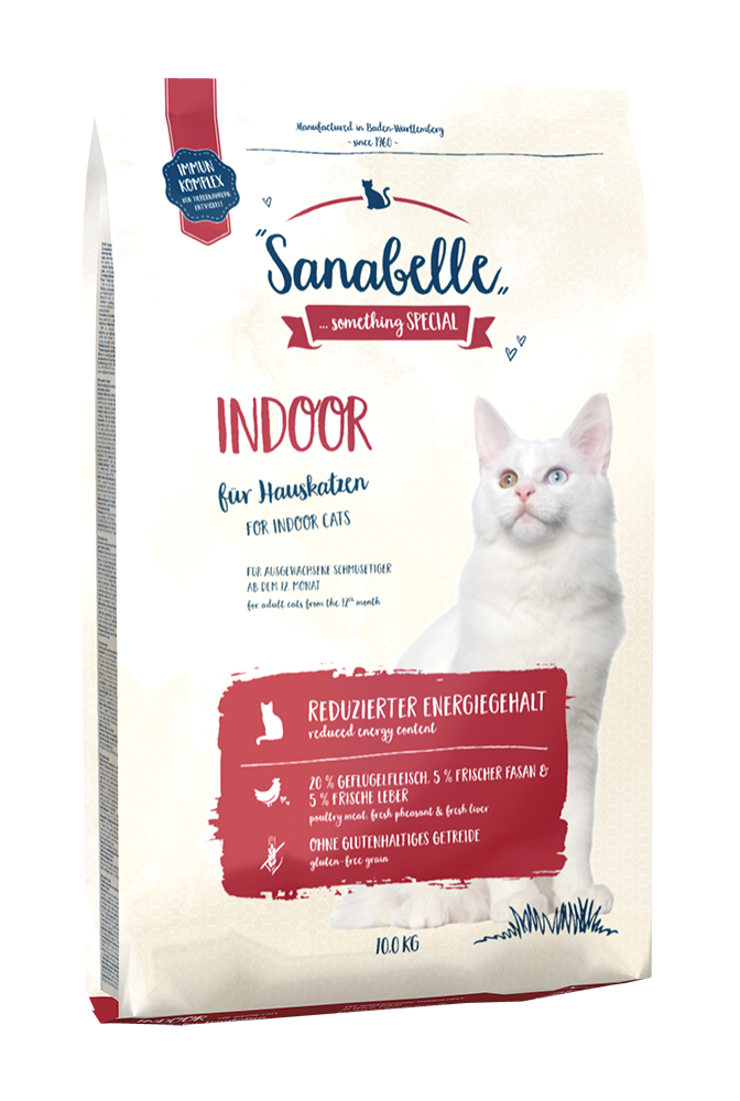 Sanabelle Indoor ist eine bek&ouml-mmliche und schmackhafte Vollnahrung speziell für Katzen, die im Haus leben (indoor). Diese Stubentiger widmen sich stärker dem Schlafen, Fressen und der Fellpflege als Freigängerkatzen. Deshalb haben sie einen geringeren Energiebedarf. Sanabelle Indoor ist an diese speziellen Bedürfnisse von Hauskatzen angepasst und kann dank dem Zusatz von pflanzlichem Yucca den Stuhlgeruch reduzieren.