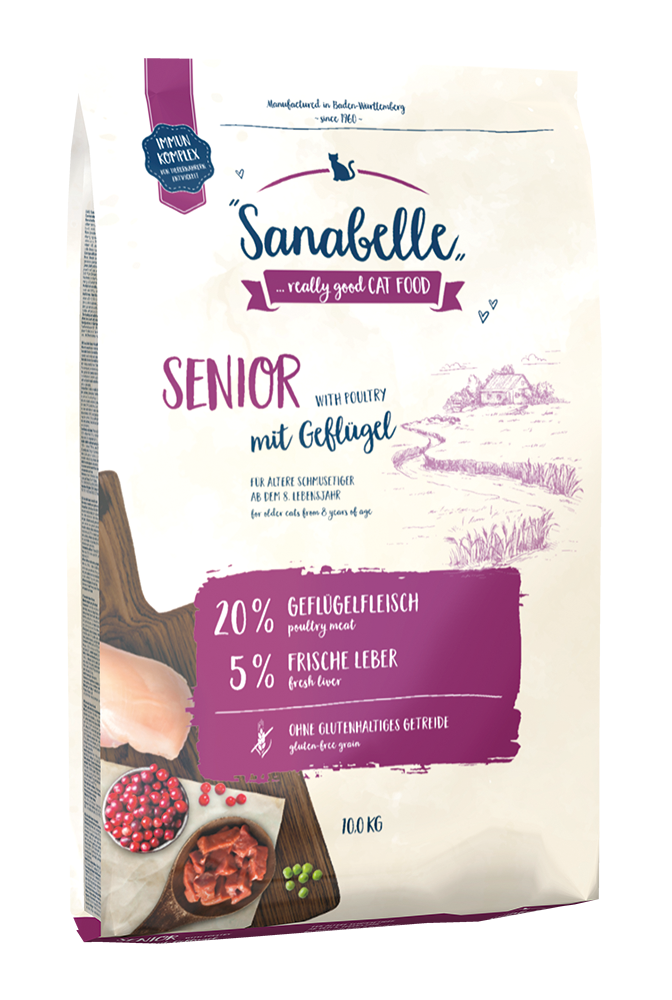 Sanabelle Senior mit Geflügelfleisch ist eine speziell auf die Bedürfnisse älterer Katzen (ab dem 8. Lebensjahr) angepasste Spezialnahrung. Durch die reduzierten Gehalte an Energie, Eiweiß und Mineralstoffen bei gleichzeitig erh&ouml-htem Anteil an speziellen Ballaststoffen (Rohfaser) trägt Sanabelle Senior mit Geflügelfleisch den sich verändernden Verhältnissen im Darmtrakt sowie dem spezifischen Stoffwechsel älterer Katzen Rechnung. Die eingesetzte Kombination von speziellen Vitaminen (z.B. Vitamin A, E) kann zudem das natürliche Sehverm&ouml-gen unterstützen und die K&ouml-rperzellen vor schädigenden Abbauprodukten schützen (anti aging).