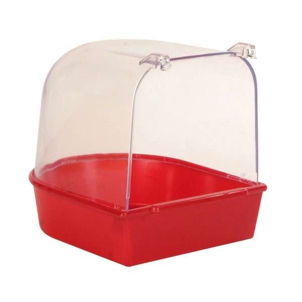 Dieses halbrunde Badehaus eignet sich für Wellensittiche, Kanarien, Finken und ähnlich große Vogelarten. Es besteht aus Kunststoff und wird einfach in die Käfigtür eingehangen. Das Oberteil ist transparent, die Wanne ist aus farbigem Kunststoff.
